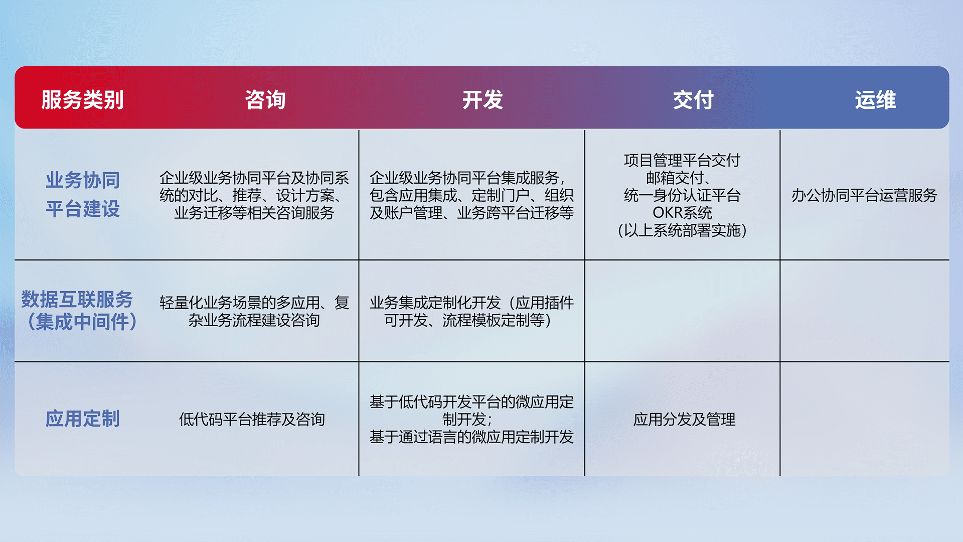 针对钉钉、、、企微、、、、IDaas等平台级产品提供产品的规划、、、、方案、、、、交付、、定制化开发等服务,,实现如统一协同办公、、、智能客户服务、、、混合会议管理、、智能数据查询、、、、等业务场景,,实现数字化转型。。。