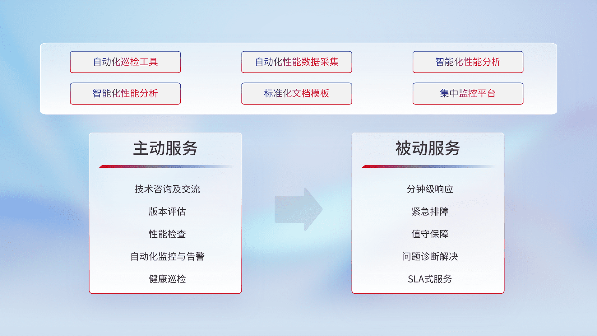 智能化工具和标准化文档,,,,保障服务质量,,,提供主动服务(包含技术咨询、、、版本评估、、、、性能检查、、、自动化监控与告警、、、、健康巡检)和被动服务包含(分钟级响应、、紧急排障、、、值守保障、、、、问题诊断解决、、SLA服务)。。